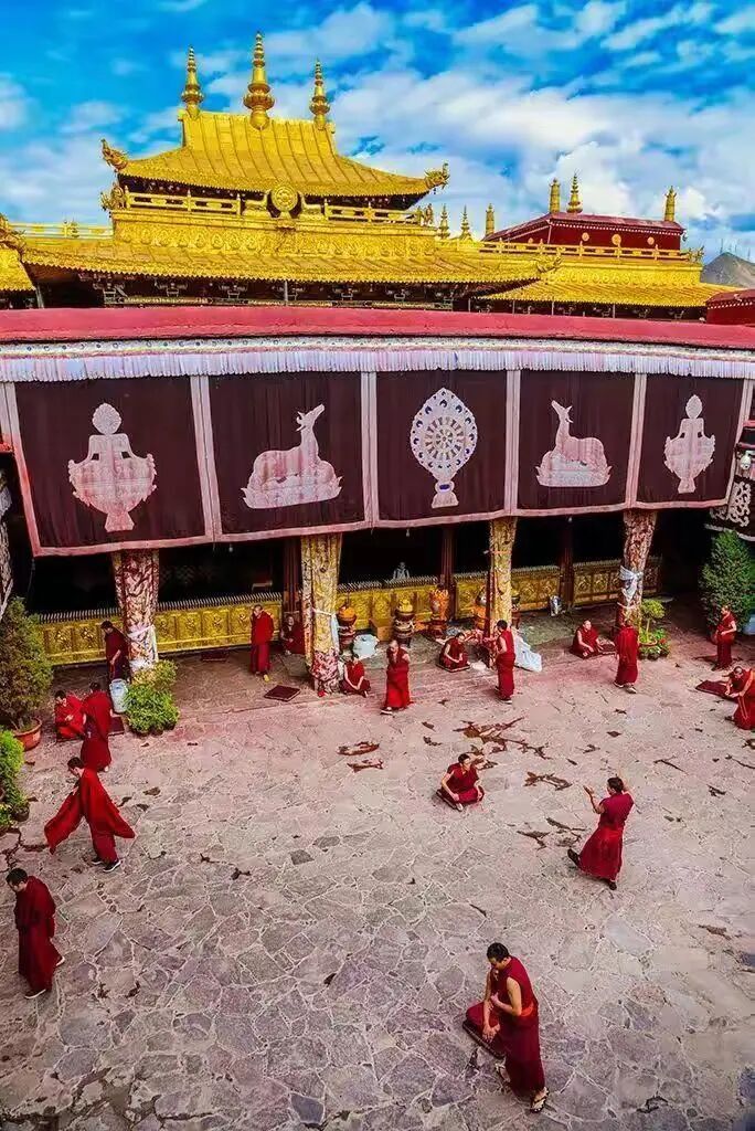 据说在千年之前,松赞干布和文成公主曾在此居住过,当年松赞干布在此闭关取材修筑了大昭寺,同时这里也是藏文的诞生地。