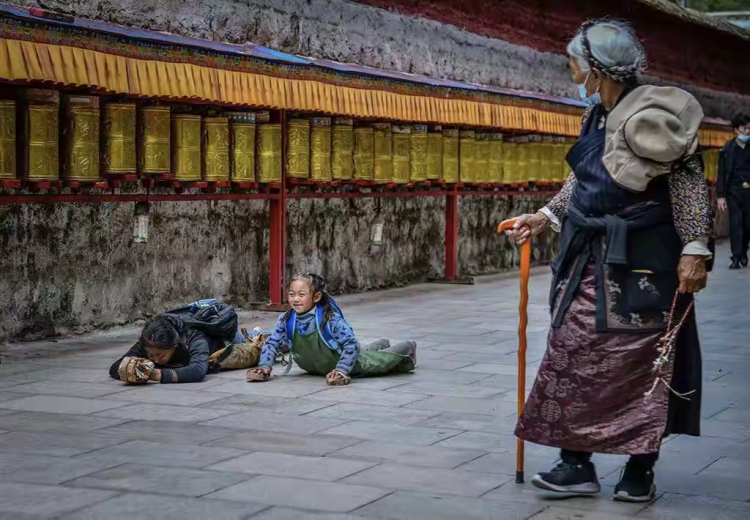 满是拍婚纱照的情侣,朝拜的僧人