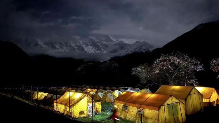 阳春三月的索松村,漫山遍野的桃花,躺在床上,窗外几枝桃花开得漫不经心,极目远望,南迦巴瓦掩映在云雾中,若隐若现。若是到了傍晚,伴着星空入眠,更是惬意。
