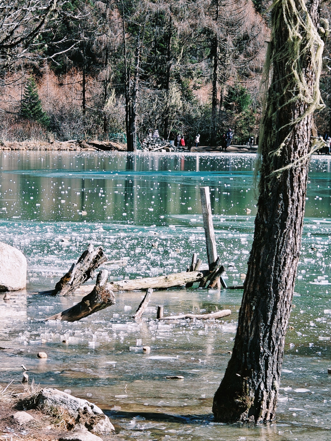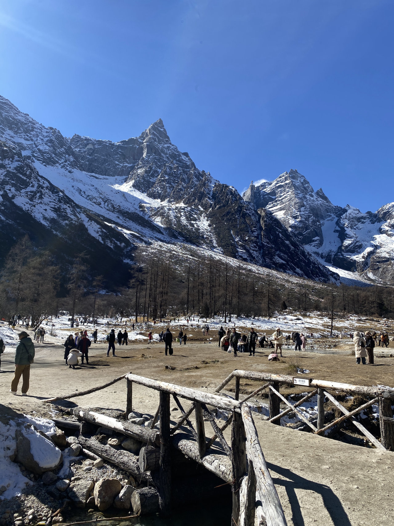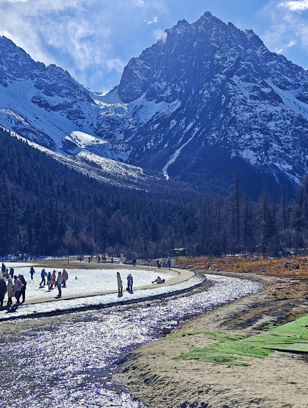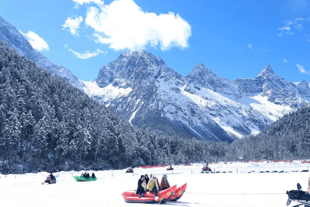 这里的天空湛蓝如宝石,与洁白的雪相互映衬,构成了一幅清新而壮观的画面。湖泊也别有一番景致,湖面背冻成了冰面,在阳光下闪烁着迷人的光泽。磐羊湖更是毕棚沟的精华所在,雪山、冰面娱乐设施一应俱全。